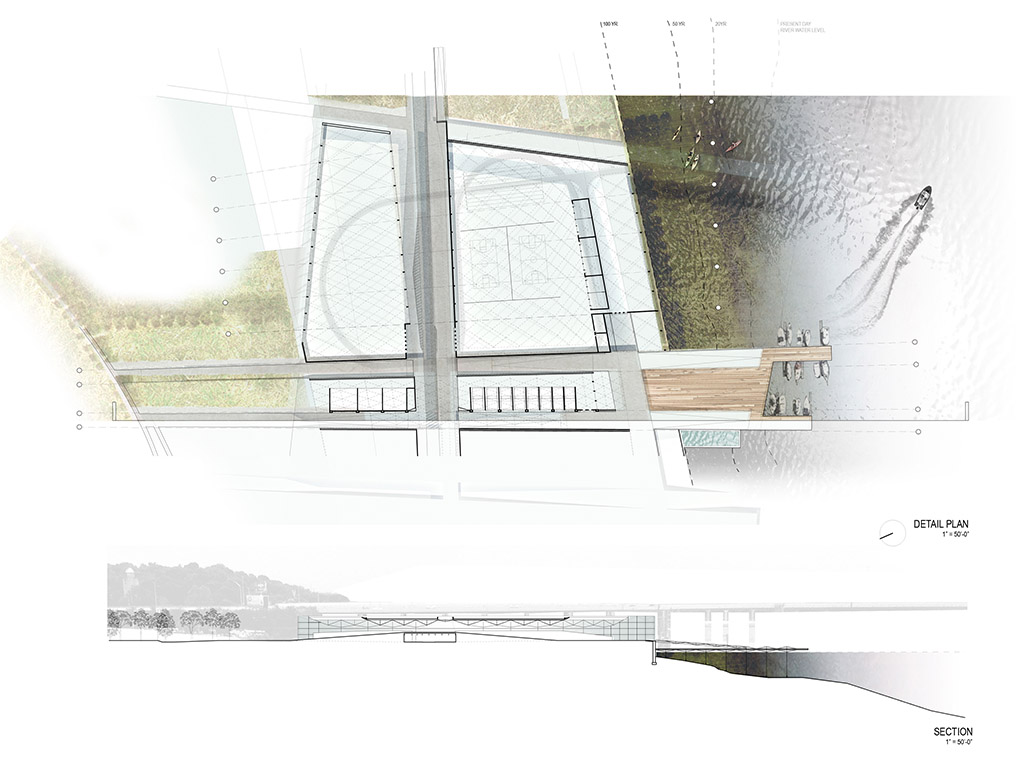 PROGRAM: The proposal is for a recreational and health facility on a brownfield site within the floodplain of the Cumberland river in Nashville. Here, people can engage in a range of activities of varying intensities. In case of flooding, the built landscape continues to provide an armature that supports the storage and distribution of emergency supplies and services.